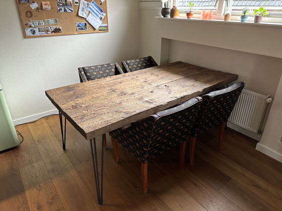 Einzigartiger, robuster Esstisch mit Holzplatte und stabilen Stahlbeinen. Dieser maßgefertigte Tisch ist ein echter Blickfang in jedem Interieur. Das Holz besticht durch seine schöne, leicht gealterte Optik. Perfekt für ein Interieur im Industrie- oder Landhausstil.