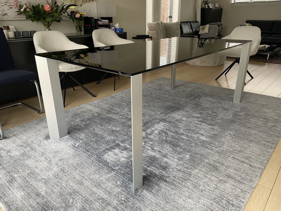 Wir präsentieren den Esstisch aus schwarzem Glas von Rolf Benz – ein Meisterwerk modernen Designs, das Eleganz und Funktionalität mühelos vereint. Dieser Tisch ist ein atemberaubendes Herzstück für jeden Essbereich und besticht durch seine elegante schwarze Glasplatte, die Raffinesse und Stil ausstrahlt.
