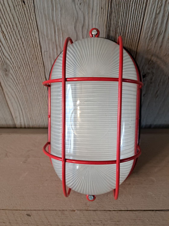 Diese markante rote Wandleuchte im Industriestil der 1980er-Jahre verleiht jedem Raum einen Hauch von Retro-Charme. Mit ihrem robusten Metallgestell und dem Glasschirm versprüht sie authentischen Industrie-Charme und passt perfekt zu modernen wie auch zu Vintage-Einrichtungen.