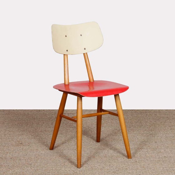 Holzstuhl wird von Ton um 1960 in der Tschechischen Republik hergestellt. Die Sitzfläche und die Rückenlehne sind bemalt. Dieser Stuhl befindet sich in einem Vintage-Zustand.