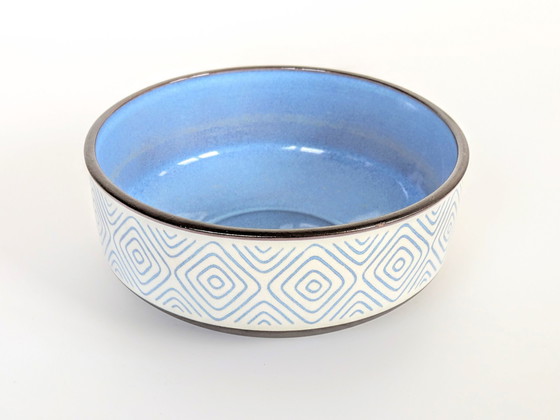 Die Innenseite ist in einem glatten und fein gesprenkelten Ozeanblau glasiert, während die Außenseite mit einem modernistischen geometrischen Muster im gleichen Farbton auf einer cremefarbenen Unterglasur verziert ist. Das dunkelbraune, matte Steingut ist im unteren Teil des Stücks und am Rand sichtbar.
