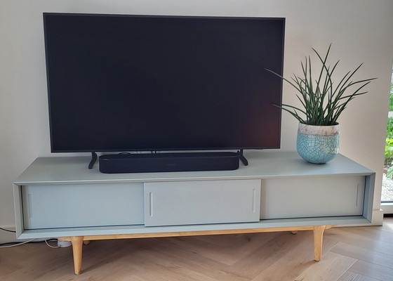 Das TV-Möbel „Ruijch Retro Ice Grey“ stammt von Ruijch. Die Retro-Kollektion des niederländischen Designlabels zeichnet sich durch den typischen Retro-Stil der 1960er-Jahre in Kombination mit einem modernen, minimalistischen Look aus. Das niedrige Möbelstück verfügt über drei Schiebetüren mit minimalistischen Griffmulden; hinter jedem Fach befindet sich eine praktische Kabeldurchführung.
