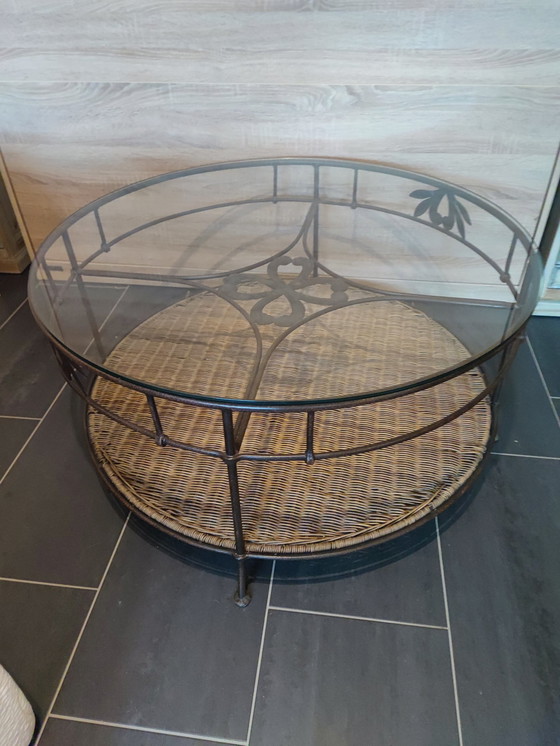Metallgestell mit einem schönen, dicken, runden Glas. Der Boden ist aus Rattan. Das Metall ist mit dekorativen Mustern strukturiert. Das Rattan ist in sehr gutem Zustand. Diese greift alles aus der aktuellen Mode auf: das begehrte Rattan, die minimalistische Metallstruktur....das Glas, dessen Schönheit man durch das Glas bewundern kann.