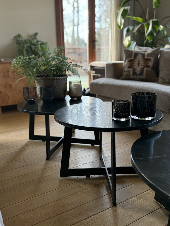 Wunderschöne Couchtische aus Marmor mit eleganten Stahlgestellen. Die beiden großen Couchtische (L) haben einen Durchmesser von 70 cm und sind 30 cm hoch. Der mittlere Couchtisch misst 60 cm im Durchmesser und 35 cm in der Höhe.
