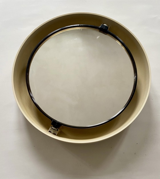 Beleuchteter runder Wandspiegel aus beigem Kunststoff von allibert. Er wird von 4 Glühbirnen e14 40w gespeist und verfügt über einen Ein-/Ausschalter. In gutem Zustand, mit kleineren Gebrauchs- und Zeitspuren. 2 Markierungen am Rand, die nicht sichtbar sind, wenn der Spiegel befestigt ist Gesamtdurchmesser: 61cm. Durchmesser des Spiegels: 48cm. Dicke: 10cm.