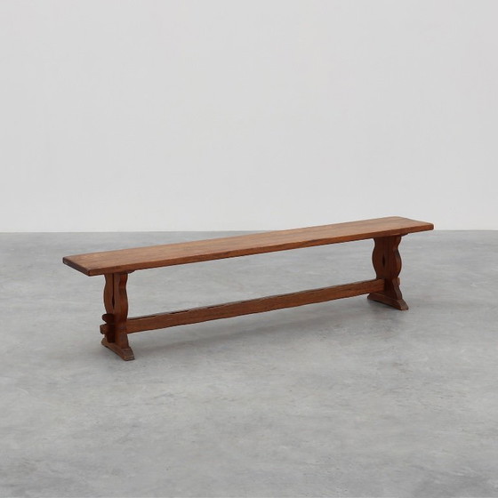 Eine rustikale Bank mit schöner Patina aus Eichenholz, gefertigt um 1900 in Frankreich. Zwei robuste Beine und eine geschnitzte Strebe sorgen für Stabilität und Langlebigkeit. Ein einzigartiges Stück, das sich perfekt als Bank, aber auch als Beistelltisch für Bücher oder Pflanzen eignet. Die robuste Konstruktion sorgt für Langlebigkeit und macht sie zu einer idealen Sitzgelegenheit für drinnen und draußen.