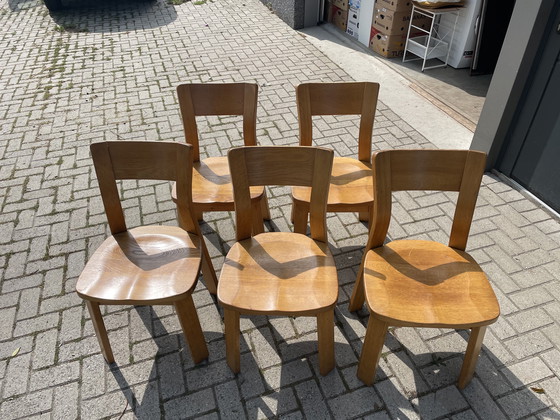 Sehr schönes Set (5 Stück) vintage Holzstühle, dänisches Design, 1970er Jahre, brutalistischer Stil mit Beinen im Stil der Bruno Ray Stühle (flache Beine) Schöne schwere Qualität und in gutem vintage Zustand.