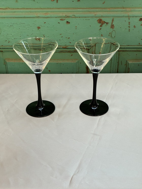 Satz von 2 französischen Martini- oder Cocktailgläsern im Vintage-Stil. Die Gläser sind von Luminarc France, Modell Domino. Sie stehen auf einem eleganten schwarzen Sockel und sind in ausgezeichnetem Zustand.