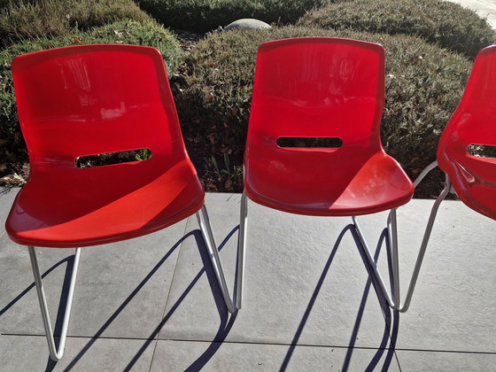 Diese Stühle von IKEA, die in den 1990er Jahren Snille hießen, basieren auf einem Entwurf von Svante Schnöblom für Overman aus den 1970er Jahren. Die Stühle haben ein hellgraues Stahlgestell mit einer feuerroten Sitzschale aus Polypropylen.