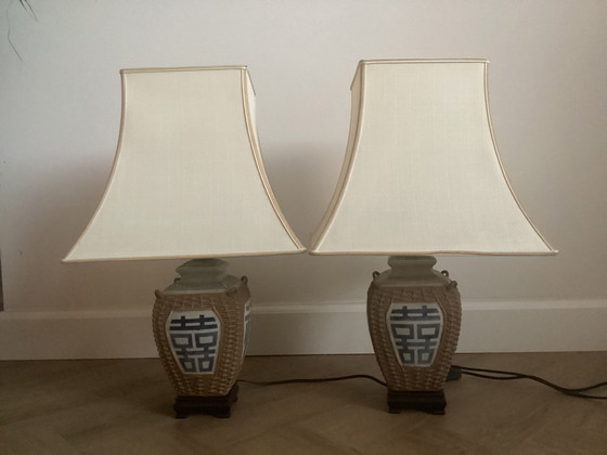 SATZ VON 2 TISCHLAMPENFÜSSEN IM CHINESISCHEN STIL AUS KERAMIK MIT BEMALUNG VON CHINESISCHEN SCHRIFTZEICHEN IM SOGENANNTEN KORB AUF EINEM HOLZSOCKEL, 35 CM HOCH INKLUSIVE FASSUNG. DIESE LAMPEN MIT GROSSEN SOCKELN SIND OHNE DIE SCHIRME VERKAUFT. DIESE LAMPEN PASSEN PERFEKT IN EINE CHINOISERIE, EKLEKTISCHE, RALPH LAUREN ODER BRITISCHE KOLONIALE EINRICHTUNG. ES SIND MÖGLICHERWEISE 2 SETS VERFÜGBAR. DIESE ARTIKEL KÖNNEN NACH ABSPRACHE IN PAPENDRECHT ODER SCHIEDAM GELIEFERT ODER ABGEHOLT WERDEN. SIEHE AUCH MEINE ANDEREN ANZEIGEN. MVG, ANNA