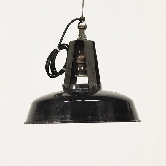 Satz von zwei industriellen Fabriklampen. Die Lampen haben einen schwarzen emaillierten Schirm und sind im Laufe der Jahre mit einer sehr dekorativen Patina versehen worden. Die Lampen haben eine neue Verkabelung und sind gebrauchsfertig. Der Preis gilt für das Set. 32cm hoch, 35cm Durchmesser. Länge des Kabels 140 cm.