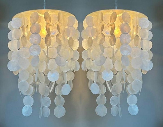 2er Set Wahrlich etwas Besonderes sind diese schönen italienischen opalisierenden Hollywood-Lampen aus echten Perlmuttmuscheln. Mit mehreren Schichten von schönen handgefertigten Muscheln, in einem besonders schönen Modell. Mit echtem Muschelkapiz-Rahmen ! Echter Blickfang diese Lampe ist komplett handgefertigt und makellos, schöne Handwerkskunst. Echte Lampe, die schön mit einem Hollywood-Vintage, und sogar Hotel chic und modernes Interieur ist. Extra luxuriös aufwendig mit weißer oder schwarzer Metall-Deckenplatte und Armatur und gepolsterter Verkabelung ! Die Größen sind: Breite 35 cm Höhe 53 cm ohne Kette und Deckenplatte gemessen Höhe mit Draht gemessen 153 cm, Draht kürzbar! Preis für das Set