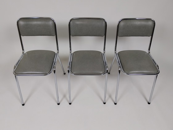 3er-Set Tavo-Stühle, 1970er Jahre. Verchromtes Rohrgestell mit grauer Kunstlederpolsterung. Die Stühle wurden von der belgischen Firma Tavo hergestellt. In gutem Vintage-Zustand mit minimalen Spuren von Gebrauch und Alter.