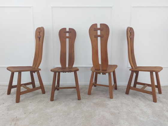 Satz von 4 Brutalistischen Esszimmerstühlen De Puydt aus massiver Eiche aus den 1970er Jahren. Sie bieten eine schöne Präsenz mit ihrer hohen, skulpturalen Rückenlehne, die typisch für den belgischen brutalistischen Stil ist.