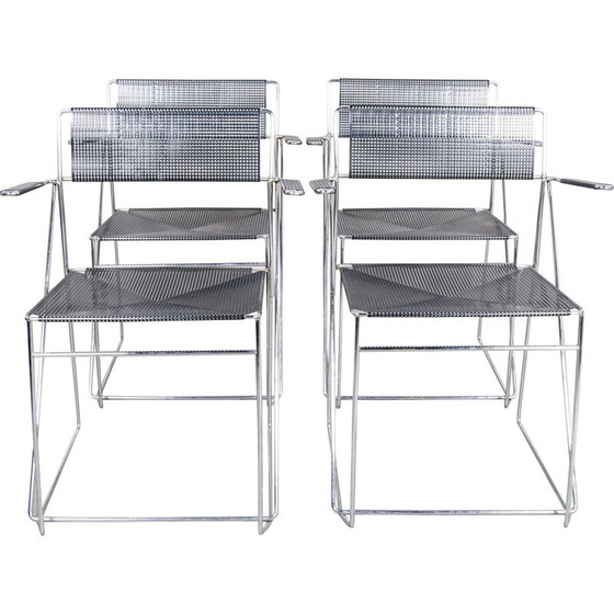 Esstischgarnitur aus 4 stapelbaren Stühlen mit Armlehnen, entworfen 1977 von Niels Jørgen Haugesen, hergestellt von Hybodan A/S, Dänemark. Gestell aus verchromtem Stahl, Rückenlehne und Sitz aus schwarzem, perforiertem Stahl.