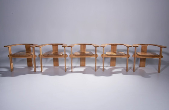Ein wunderschönes Set aus fünf massiven Eichenstühlen, die sich durch ihre weichen, skulpturalen Linien und ihre warme, natürliche Oberfläche auszeichnen. Diese Stühle verbinden zeitlose Eleganz mit funktionellem Komfort und sind somit eine ideale Ergänzung für moderne und klassische Einrichtungen.