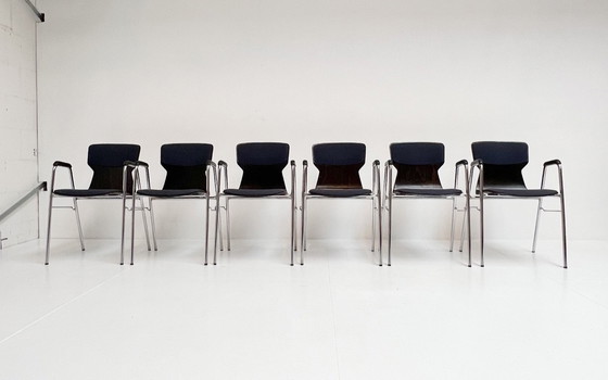 Wunderschönes Set organisch geformter Fourmi-Schulstühle mit Armlehnen von Obo Eromes. Diese stapelbaren Stühle stammen aus den 1960er Jahren. Sie verfügen über einen Stahlrahmen, abgerundete Sitzflächen aus Ebenholz und bequeme Armlehnen aus PVC. Einzigartig an diesem Set sind die blau gepolsterten Rückenlehnen. Sie weisen minimale Gebrauchsspuren auf und haben ein kleines Loch im Stoff eines Stuhls.