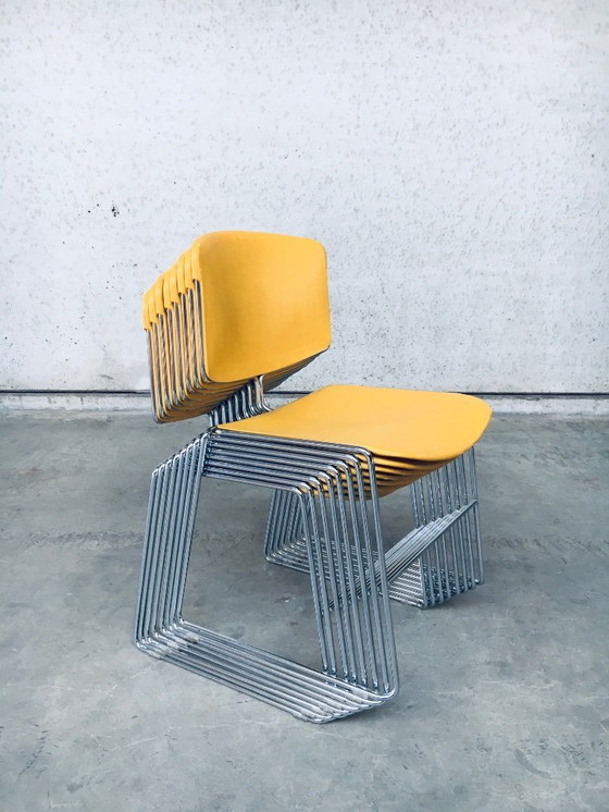 Vintage Original MAX STACKER Konferenz-/Bürostuhl, 8er-Set von Steelcase Strafor Edition, hergestellt in den USA in den 1970er/80er Jahren. Sitzfläche und Rückenlehne aus gelbem Kunststoff auf verchromtem Metallrahmen. Alle Stühle sind patiniert und weisen Gebrauchsspuren in den gelben Kunststoffteilen auf. Alle Stühle sind in gutem bis sehr gutem Zustand. Flecken und Kratzer auf dem gelben Kunststoff. Stapelbares Set mit 8 Stühlen. Jeder Stuhl misst 80 cm x 49 cm x 54 cm.