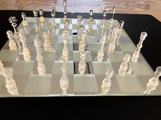 Schachbrett auf Spiegel mit Glasbauern, komplett selbst gemacht