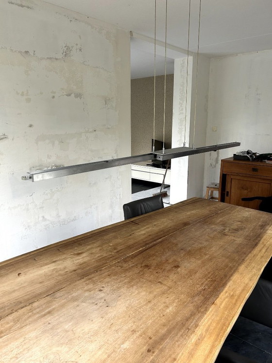 Die Leuchte lässt sich dank der beiden 120 cm langen, aneinander verschiebbaren Strahlen auf bis zu 2 Meter ausfahren. Im nicht ausgefahrenen Zustand ist die Leuchte 120 cm breit. Jeder Lichtstrahl verfügt über 5 dimmbare LED-Lichtpunkte, insgesamt also 10 Lichtpunkte.