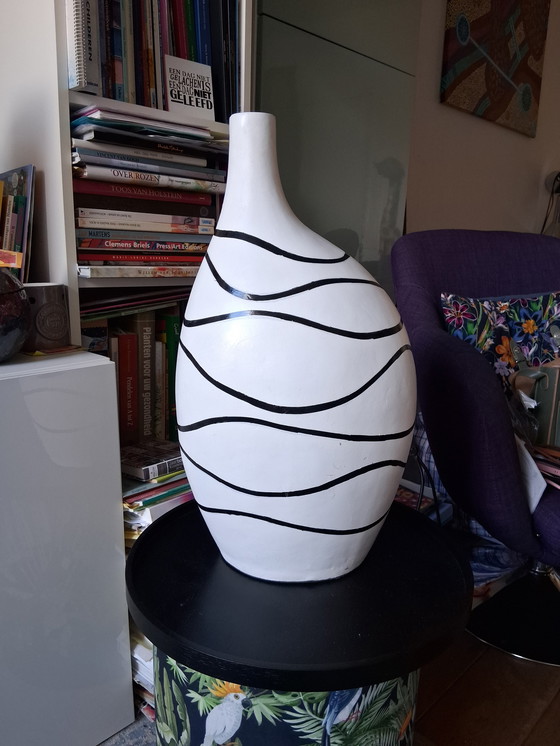 Diese schöne Keramikvase in Schwarz und Weiß ist ein echter Hingucker im Pop-Art-Stil. Das schlichte Design mit gewellten schwarzen Linien auf weißem Hintergrund macht sie zu einem stilvollen und modernen Dekorationsstück. Perfekt, um jedem Interieur einen künstlerischen Touch zu verleihen. Die Vase wiegt 8,9 kg, also per Kurier verschicken oder in Venlo abholen.