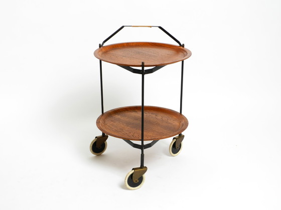 Schöner klappbarer Mid-Century Modern Servierwagen. Auch als Beistelltisch geeignet. Mit abnehmbaren, runden Teakholzschalen aus Pagholz. Der Rahmen ist aus schwarz lackiertem Metall gefertigt. Alle drei Räder rollen und drehen sich reibungslos. Keine Schäden am Rahmen. Kein Rost und Originallackierung. Beide Ablagen sind in gutem Zustand. Keine Beschädigungen. Keine Risse oder Brüche. Natürlich sind leichte Gebrauchsspuren sichtbar. Das Gestell ist faltbar und leicht, so dass es überall leicht zu verstauen ist. Insgesamt sehr guter Vintage-Zustand. Wahrscheinlich sehr wenig benutzt. Hergestellt in Deutschland in den 1950er Jahren. 100% Originalzustand, sofort bezugsfertig und sehr dekorativ. Geeignet für alle Wohnbereiche.
