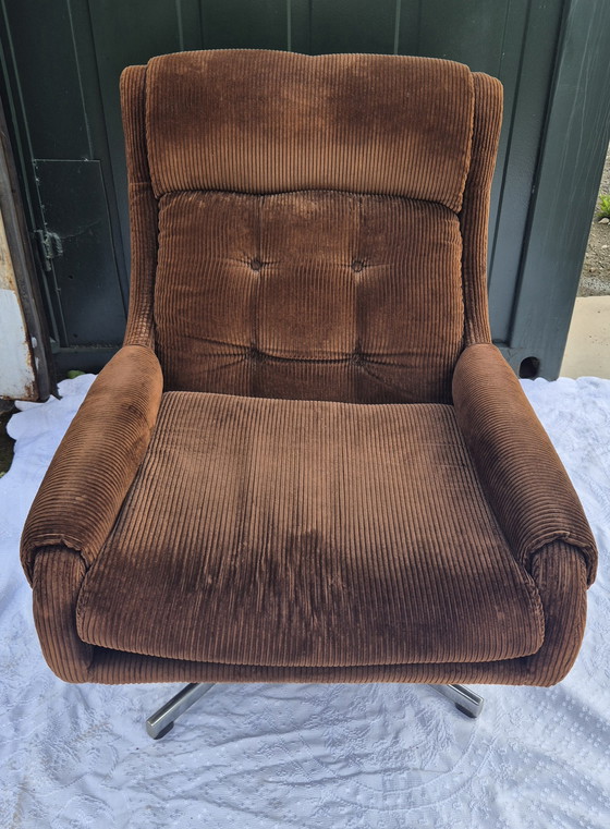 Dieser schöne Sessel bietet mit seiner weichen, braunen, gerippten Samtpolsterung und der verstellbaren Rückenlehne höchsten Komfort. Das Vintage-Design verleiht jedem Raum einen klassischen Charme. Das robuste Metallgestell sorgt für Stabilität und Langlebigkeit. Perfekt zum Entspannen nach einem langen Tag.