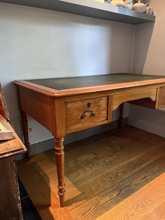 Schreibtisch mit Ledereinlage. 150 x 85 x 81 cm, Eichenholz-Finish.