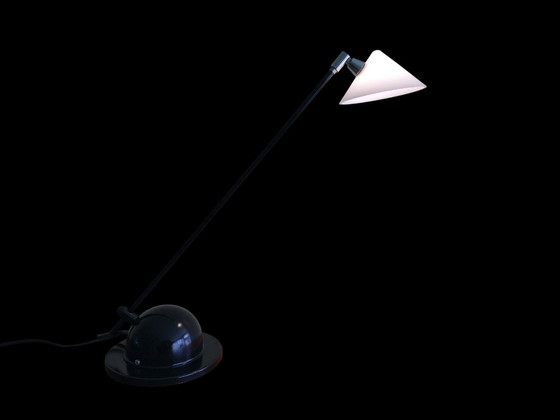 Seltene Tischlampe von Pola Design Amstelveen. Schwarze Metallleuchte mit verstellbarem weißem Glasschirm. Die Lampe ist dimmbar mit Hilfe von Schnurdimmer. In sehr schönem Zustand und in guter Funktionstüchtigkeit. Die Lampe ist 42 cm hoch und 40 cm tief, der Sockel hat einen Durchmesser von 15 cm. Leuchtmittel Halogen G4.