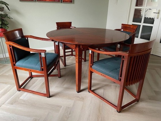 Original Schuitema runder Esstisch 130 cm, mit vier Stühlen. Der Tisch kann mit einem ausklappbaren Teil zu einem ovalen Tisch von 175 cm Länge erweitert werden. Die Polsterung ist von De Ploeg in blau/grün. Die Größen der Stühle sind an anderer Stelle in der Anzeige angegeben.