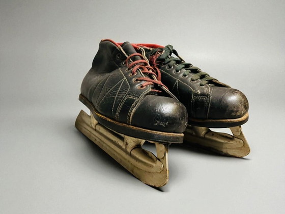 Ein Paar Schlittschuhe aus echtem Leder, mit Stahlkufen. Eine Spitze ist noch original.