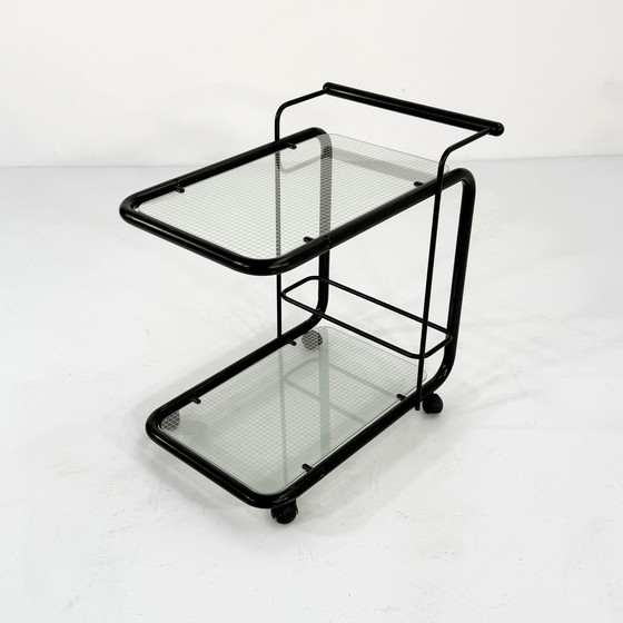 Schwarzer postmoderner Servierwagen mit Quaderna-Muster, 1980er Jahre Design Periode - Achtziger Jahre Maße - Breite 46 cm x Tiefe 69 cm x Höhe 72 cm Materialien - Metall, Glas Farbe - Schwarz Kommentare - Leichte Abnutzung im Einklang mit Alter und Gebrauch.