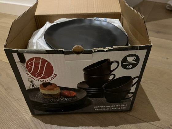 Elegantes schwarzes Geschirr von Hamilton Lodge, bestehend aus zwei Sets: einem 18-teiligen Kaffeeservice und einem 12-teiligen Speiseservice. Perfekt für den täglichen Gebrauch und besondere Anlässe. Das moderne Design und die hochwertige Keramik machen dieses Geschirr zu einer stilvollen Bereicherung für jeden Tisch.