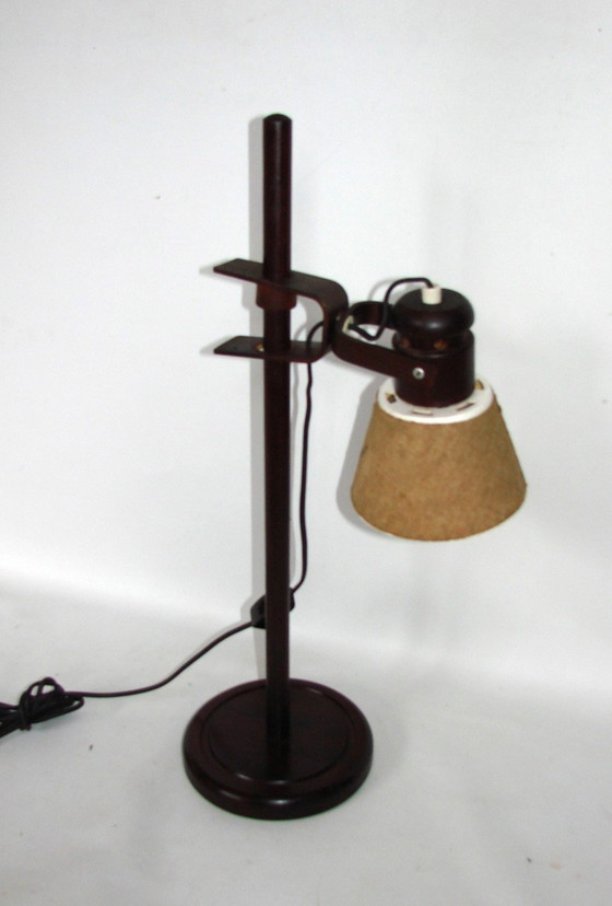 Schwedische Tischlampe, GB Solbackens Svarveri, 1970er Jahre Sie ist aus Holz und Kunststoff gefertigt. Die Lampe hat bewegliche Schirme und benötigt 1 E27 Glühbirne. Abmessungen: H.66cm Breite 30cm