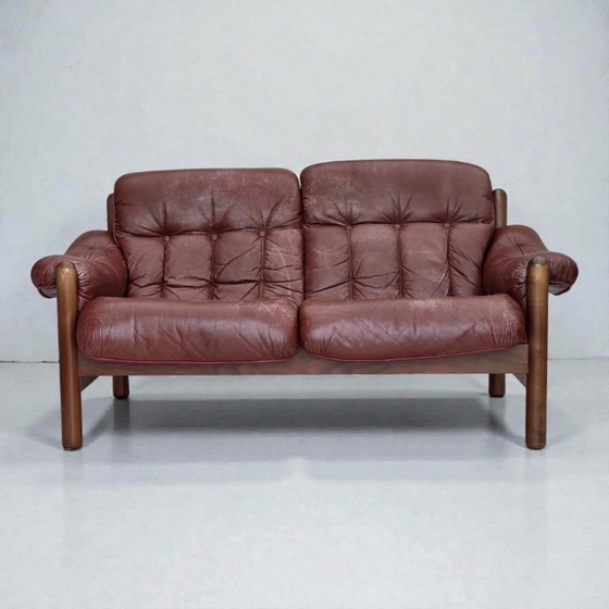 Schwedisches 2-Sitzer-Sofa aus den 1970er Jahren, braunes Leder mit Patina, dunkles Buchenholz.