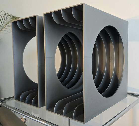 Dies ist nicht nur ein LP-Rack; es ist ein architektonisches Statement. Das futuristische Design mit den charakteristischen runden Aussparungen erzeugt einen faszinierenden Tiefeneffekt und ein faszinierendes Schattenspiel, das sofort ins Auge fällt. Es passt perfekt auf ein Sideboard, in einen Schrank mit Fächern (wie z. B. USM Haller) oder als Blickfang in ein minimalistisches Interieur.