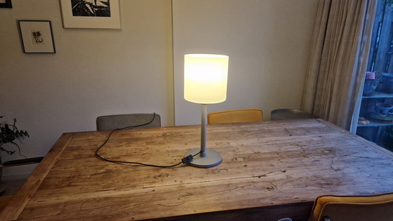 Markante Sideboard-Tischleuchte von Rotaliana: schwerer, grau lackierter Metallfuß und mattierter Glasschirm. Geeignet für alle Leuchtmittel. Der Dimmer fehlt (siehe kleines Loch im Fuß), lässt sich aber problemlos ersetzen.