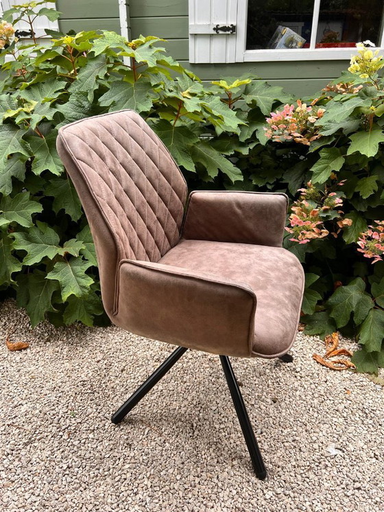 Satz von 2 (nicht sechs) stilvollen Esszimmerstühlen in neuwertigem Zustand. Die Stühle sind sehr bequem und haben eine Polsterung in Lederoptik in Taupe-Braun, mit einer modernen rautengenähten Rückenlehne und schwarzen Metall-Spinnenbeinen.