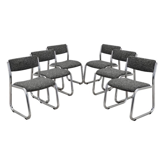 Das Gestell ist aus Metall. Die Stühle sind neu bezogen. Der graue Bezug besteht aus hochwertigem Stoff.