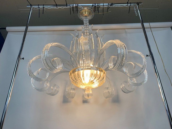 Dieser exquisite Seguso Vetri d'arte-Kronleuchter aus den 1950er Jahren ist ein beeindruckendes Beispiel für modernes Design aus der Mitte des Jahrhunderts. Er ist aus hochwertigem Glas gefertigt und verfügt über elegante, wirbelnde Arme und eine zentrale Säule, die Raffinesse ausstrahlt. Das transparente Glas ist mit subtilen goldenen Details verziert, die jedem Raum einen Hauch von Luxus verleihen. Perfekt für alle, die ihre Einrichtung um ein zeitloses Stück im Vintage-Stil ergänzen möchten.