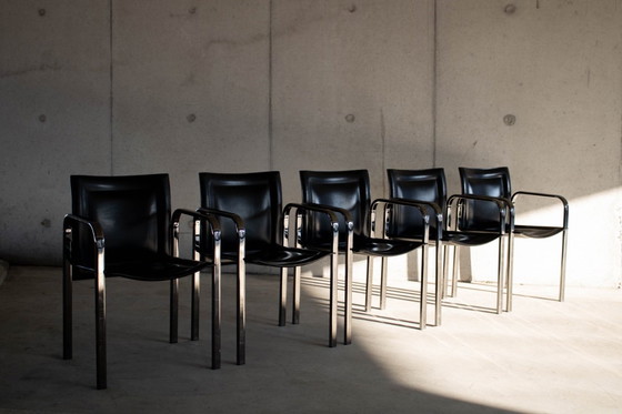 Seltene Arrben (Malena) Sessel aus den 1980er Jahren. Ein Set aus fünf Sesseln aus schwarzem Rindsleder mit einem robusten Gestell in schwarzem Nickel-Finish.