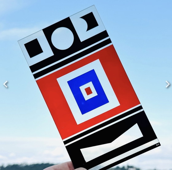 Entdecken Sie eine seltene kinetische Platte von Nicolas Schöffer, einem Pionier der kinetischen und kybernetischen Kunst. Dieses Stück aus Plexiglas zeigt ein vibrierendes geometrisches Dekor mit gewagten Farben wie Rot, Blau, Schwarz und Weiß. Es ist mit dem Monogramm des Künstlers unten rechts signiert und misst 21,5 cm x 12 cm. Dieses Werk ist ideal für Sammler moderner Kunst und verkörpert die Innovation und Interaktion, die für Schöffers Arbeit charakteristisch sind. Obwohl einige kleine Kratzer vorhanden sind, beeinträchtigen sie nicht die visuelle Integrität des Werks.