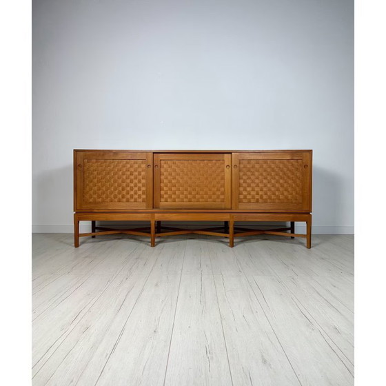 Schönes, seltenes und gut erhaltenes dänisches Vintage-Sideboard von Ilse & Ove Rix für Uldum Møbelfabrik. Hergestellt in Dänemark in den frühen 1960er Jahren. Sehr hochwertige Verarbeitung mit viel Liebe zum Detail in Teakholz. Das absolute Highlight sind die holzgeflochtenen Fronten der Schiebetüren. Das Sideboard besticht durch seine konsequent klare Struktur und Linienführung und verleiht ihm ein zeitloses Design. Sehr gepflegter Originalzustand mit nur sehr wenigen altersbedingten Gebrauchsspuren (kleines Loch für Kabel im unteren Mittelteil auf der Innenseite).