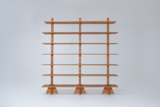 Das Regal besteht aus Ulmenholz und umfasst sieben Regalböden, die von drei Stützen zusammengehalten werden. Durch Verschieben der Verbindungsstücke unter den Regalböden lässt sich deren Höhe verändern.