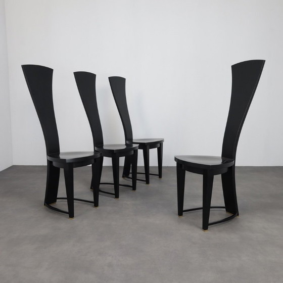 Ein seltenes und elegantes Set aus vier italienischen Hochlehner-Esszimmerstühlen aus den 1990er-Jahren. Ihre skulpturalen, ausgestellten Rückenlehnen und die konischen Beine verleihen ihnen eine markante architektonische Präsenz, während der tiefschwarze Lack und die Messingfüße für eine raffinierte Balance sorgen.