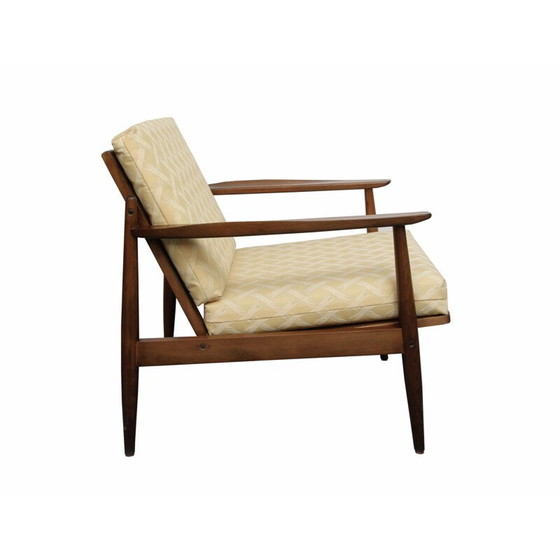 1960er Jahre Sessel, schöne Konstruktion aus massivem dunklem Holz. Abnehmbare Kissen in gelbem Stoff mit Muster. Plus ein kleines Kissen (siehe Bild). Sehr guter Zustand, nur kleine Gebrauchsspuren. Sitzhöhe 42cm.