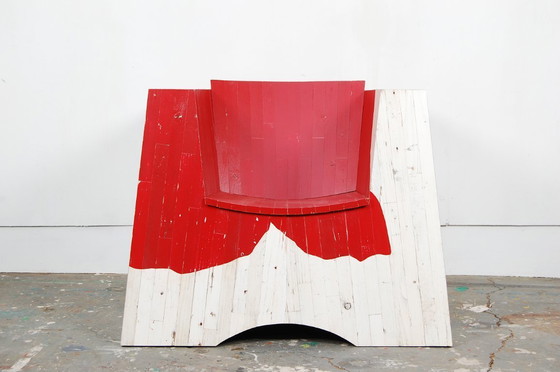 Dieser Sessel ist das am intensivsten bearbeitete Objekt der Serie. Die ursprünglich sechs Meter langen Bohlen wurden zunächst in rote und weiße Stücke, dann in vier Zentimeter breite Streifen gesägt. Dann begann der Zusammenbau: ein sorgfältiger Prozess der Umstrukturierung und Platzierung. Die markante Linie zwischen Rot und Weiß entstand, indem ein echtes Grand Foulard (ein großes Tuch) über und in den Rahmen drapiert wurde; die daraus resultierende Form wurde auf das Holz übertragen. Die roten und weißen Paneele wurden genau entlang dieser Linie zugeschnitten und fügen sich wie ein Puzzle zusammen.