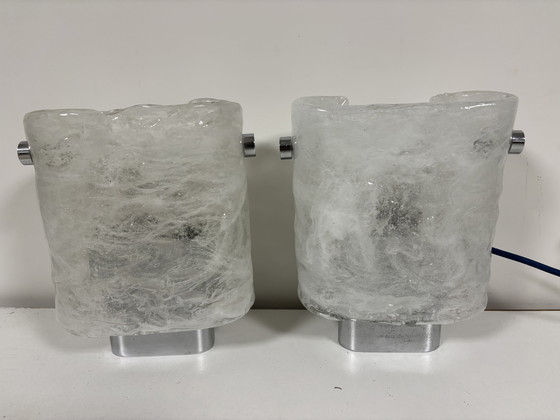 Erhellen Sie Ihre Räume mit der zeitlosen Eleganz dieses zweiteiligen Hillebrand-Wandleuchten-Sets aus Eisglas. Diese exquisiten Leuchten im Mid-Century-Modern-Stil bestechen durch ihr faszinierendes Eisglas-Design, das das Licht sanft streut und eine warme, einladende Atmosphäre schafft.