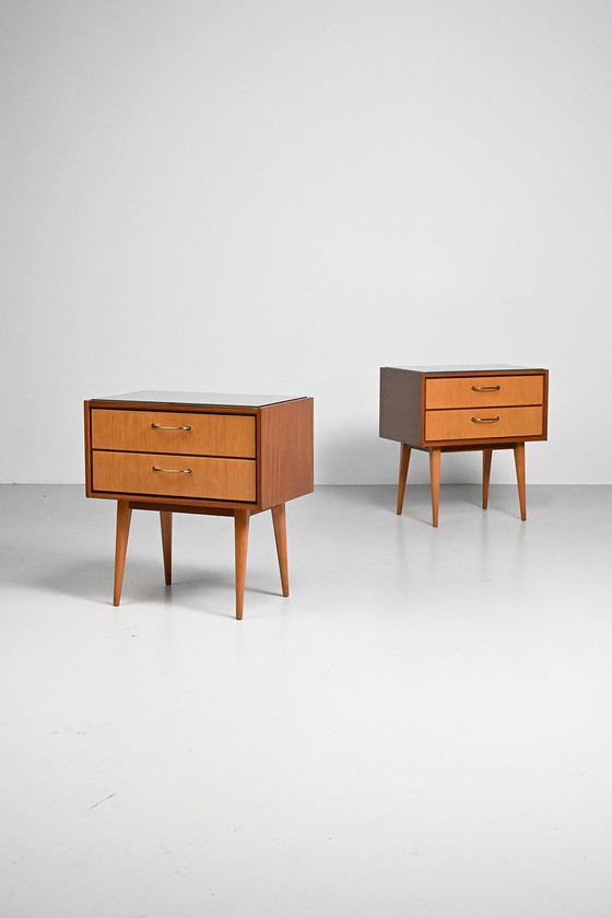 Zwei Nachttische aus den 1960er-Jahren, hergestellt in Deutschland. Mit schrägen Beinen, goldfarbenen Metallgriffen und Glasplatten sind sie ein Paradebeispiel für das Design jener Zeit. Diese Nachttische sind derzeit sehr begehrt, also greifen Sie schnell zu! Sie befinden sich in gutem Vintage-Zustand.