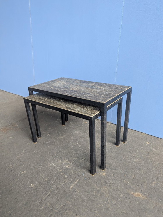 Zwei Beistelltische im Mid-Century-Stil von Artimeta, entworfen von Floris Fiedeldij in den 1950er-Jahren. Die Tischplatten aus Schiefer bestechen durch wunderschöne, gesprenkelte Farbtöne und eine raue Oberfläche. Das Gestell aus schwarzem Stahl ist elegant und massiv. Die Tische lassen sich platzsparend ineinander schieben. Zeitloses niederländisches Design!
